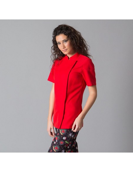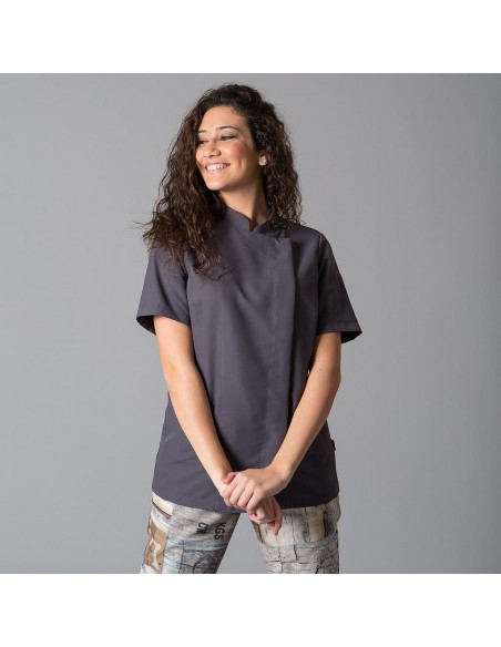 Esta chaqueta está confeccionada para combinar estilo y funcionalidad. Presenta una manga corta y un cuello mao, lo que le da un aspecto elegante. Además, cuenta con un bolsillo en la manga izquierda y un cierre cruzado mediante botones de presión ocultos. Su diseño semi ajustado, con pinzas en el pecho y costadillos en la espalda, asegura un ajuste perfecto y cómodo.