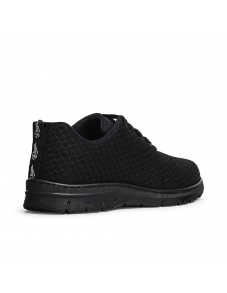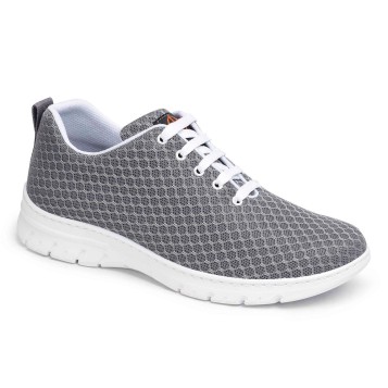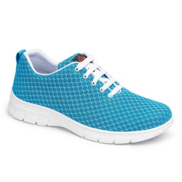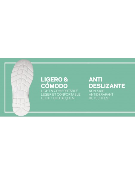 Zapatilla tipo blucher con corte de una sola pieza, sin costuras y con cierre de cordones. Corte textil transpirable y repelente a liquidos D’COVER DRY®, forrado interior de material textil acolchado D’DRY®, collarín acolchado en el tobillo para evitar rozaduras. Horma recta de puntera redondeada. Contrafuerte de dureza suficiente para sujetar el calcáneo. Plantilla acolchada de material textil sobre espuma de poliuretano termoconformado con tratamiento antibacterias y carbón activado. Suela de material compuesto, ultra ligera, confortable, flexible y antideslizante, con diseño de pastillas planas, cantos vivos y acanaladuras amplias para facilitar la evacuación de líquidos. Apto para lavado en lavadora hasta 40º.
