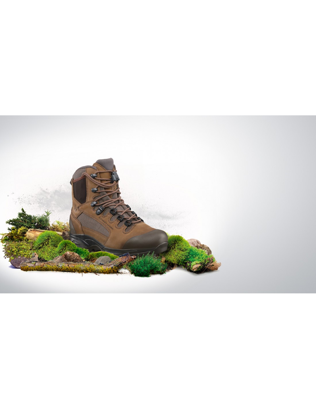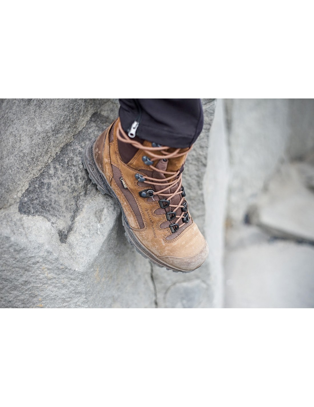 - Las botas de montaña están fabricadas en piel nobuck hidrofóbica. Es repelente al agua, transpirable y especialmente robusto.