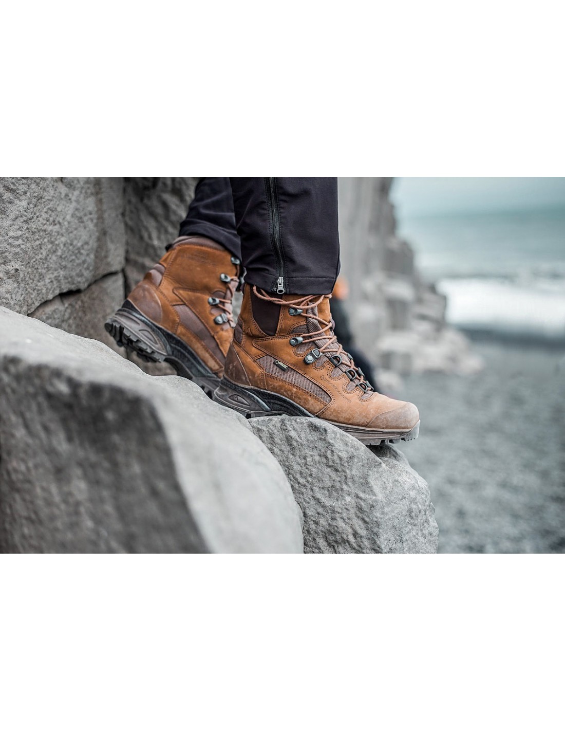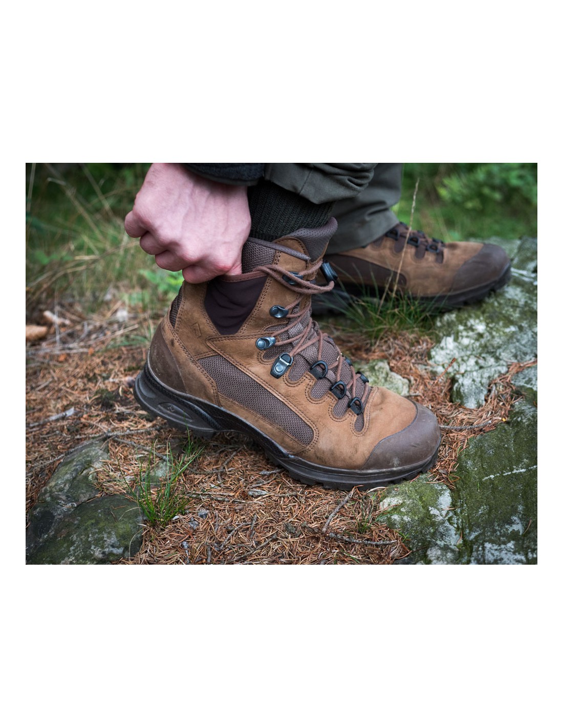 La suela de goma Vibram garantiza que no resbalarás en superficies pedregosas, caminos resbaladizos o suelos de bosques embarrados. Es particularmente robusto y resistente. La bota militar termina 17 cm por encima del tobillo. Esto protege tus articulaciones y evita que te retuerzas en el bosque o en la montaña.