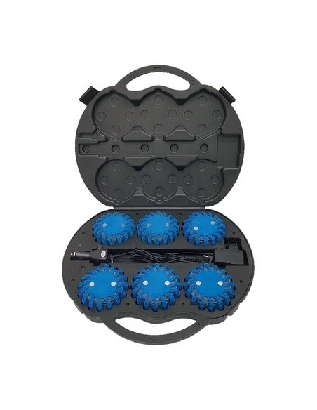Maletín con 6 unidades de balizas luminosas LED, emiten destellos de luz de color naranja o