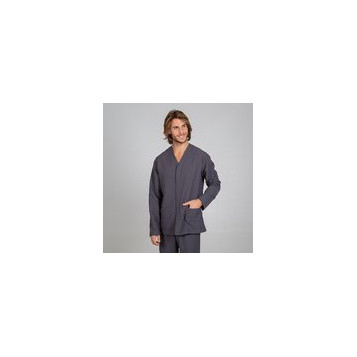 Casaca Hombre Néstor, diseñada para profesionales de la salud y la industria alimentaria. Esta prenda de manga larga presenta un elegante cuello pico y se cierra mediante botones de presión ocultos, proporcionando un aspecto pulcro y moderno. La casaca, semi ajustada, cuenta con dos bolsillos de parche en la parte delantera y presenta pinzas en la espalda y aberturas laterales para un ajuste cómodo y favorecedor.