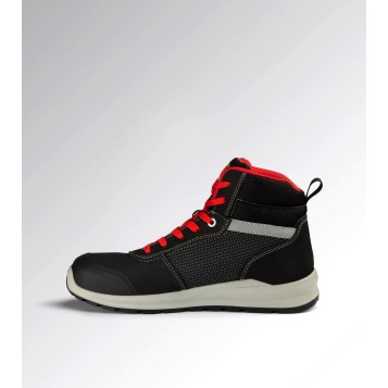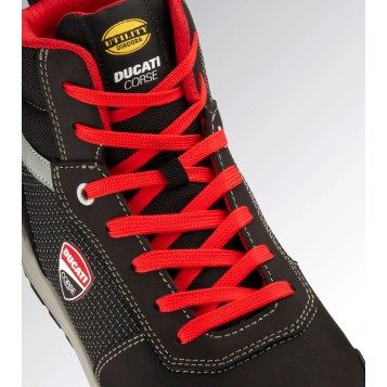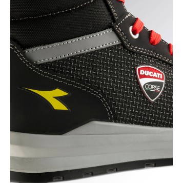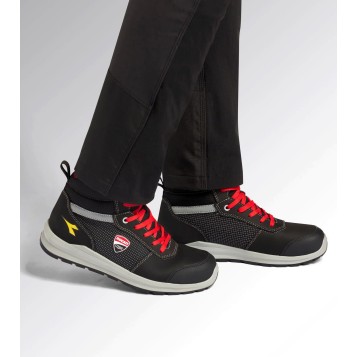Calzado de seguridad de altura media S3S hidrorrepelente fabricado con Action Nubuck, un ante de vacuno recubierto con una capa protectora de poliuretano con acabado de nobuk y Atom, un tejido de poliéster con hilos de refuerzo de poliuretano. Personalización DUCATI CORSE. Protección de la punta en TPU. Puntera de Multilayer 200J. Aplicación antiperforaciones K-SOLE. Ajuste 11. Forro de Air Mesh. Plantilla extraíble microperforada en espuma de PU expandido de celdas abiertas y transpirable con carbones activos. Sin metal.