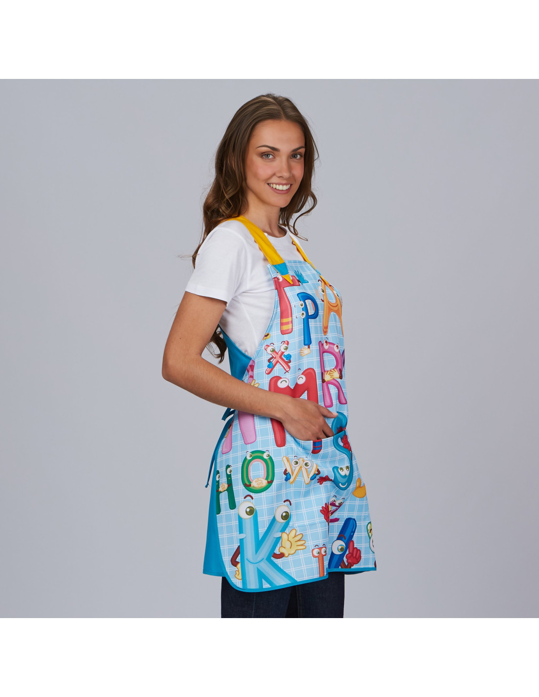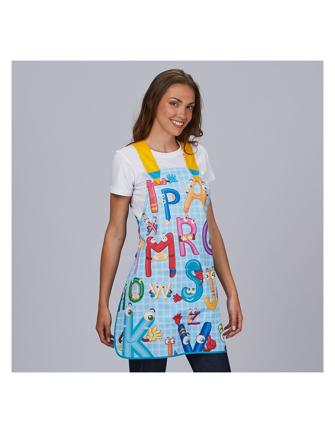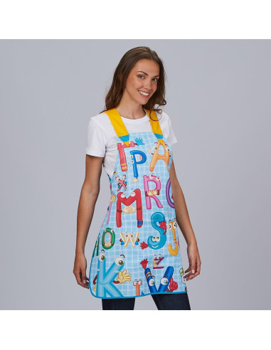 La Casulla ABECEDARIO está estampada con un diseño original que incorpora letras del abecedario de manera creativa y lúdica. Este diseño educativo es perfecto para estimular la curiosidad y el aprendizaje de los niños en el entorno escolar.