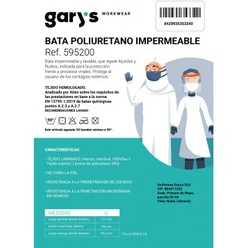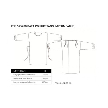Bata de poliuretano impermeable y lavable, repele líquidos y fluidos. Indicada para la protección frente a procesos virales. Protege al usuario de los contagios externos, de contaminación, humo, polvo e irritantes novivos.