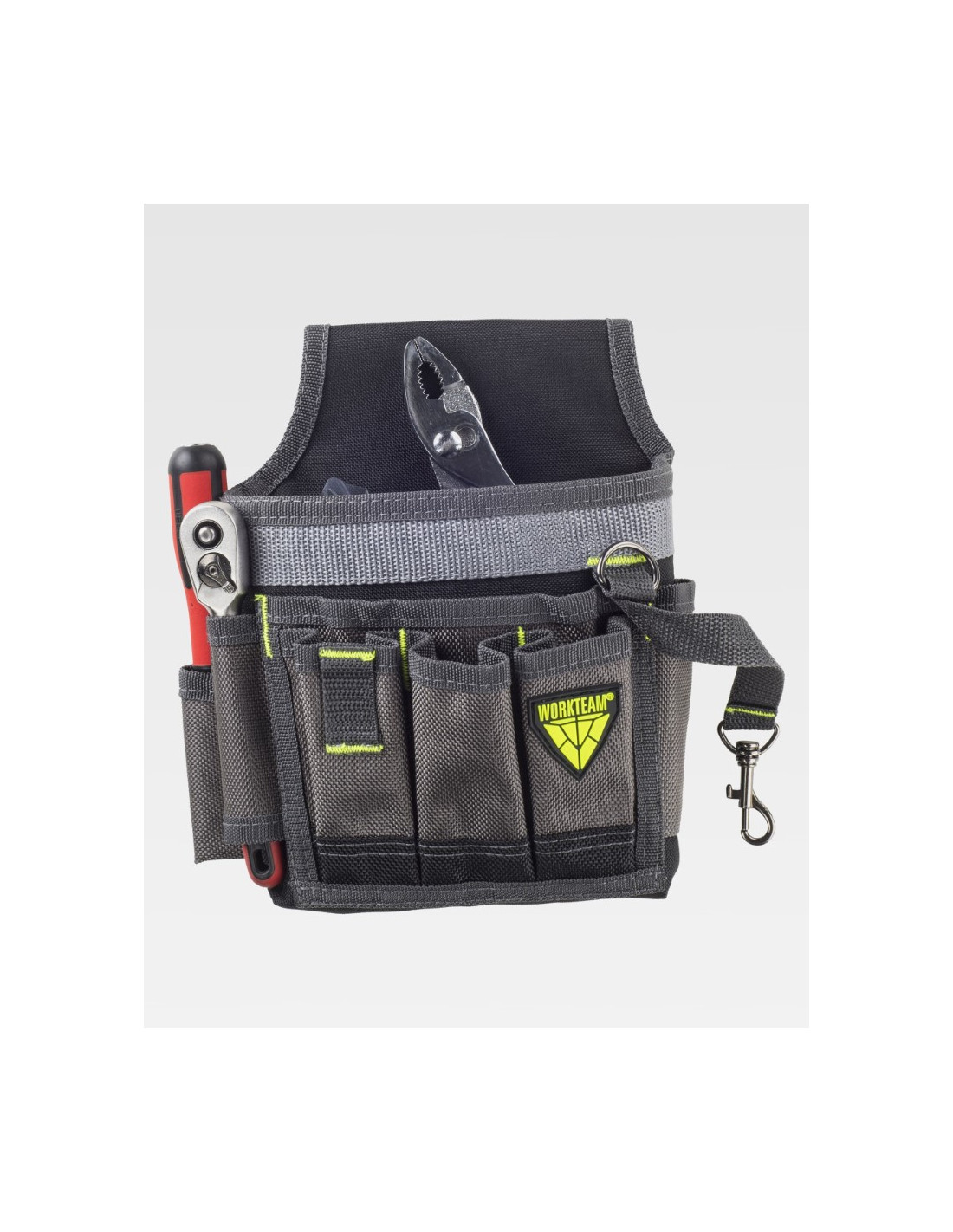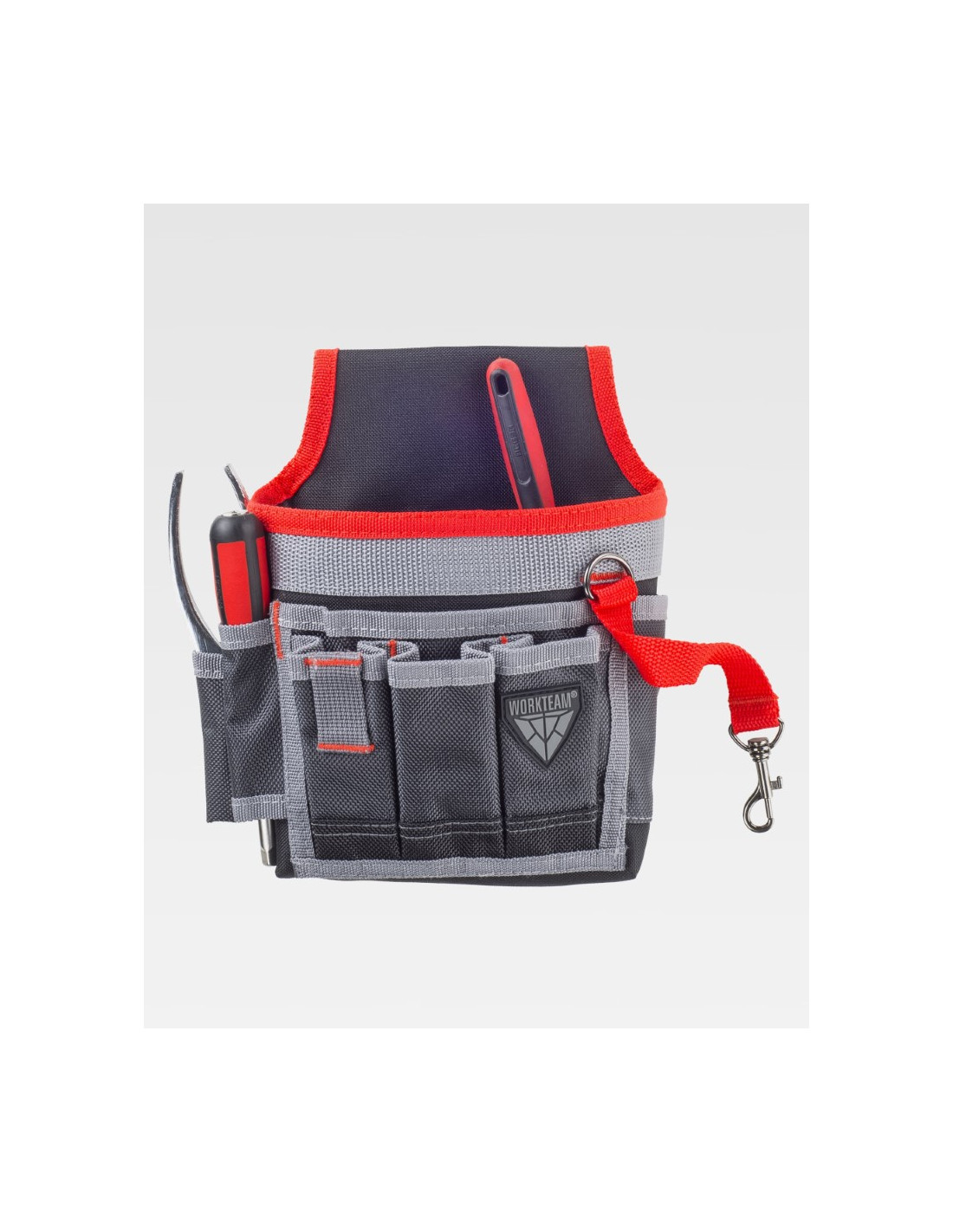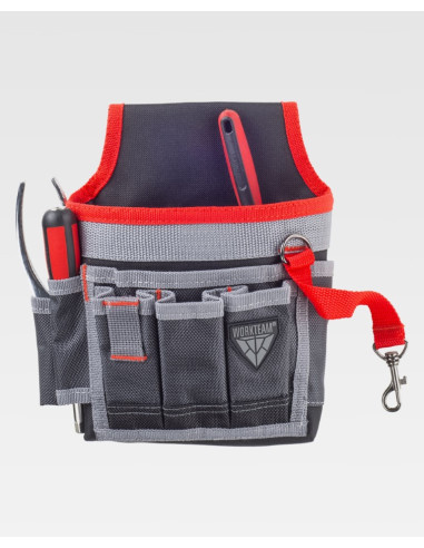 Bolsa para herramientas multibolsillos con diversas aberturas. Argolla metálica y tira con mosquetón. Enganche metálico para ajustar al cinturón. Bies a contraste. Dimensiones: 23x19x4 cm aprox.