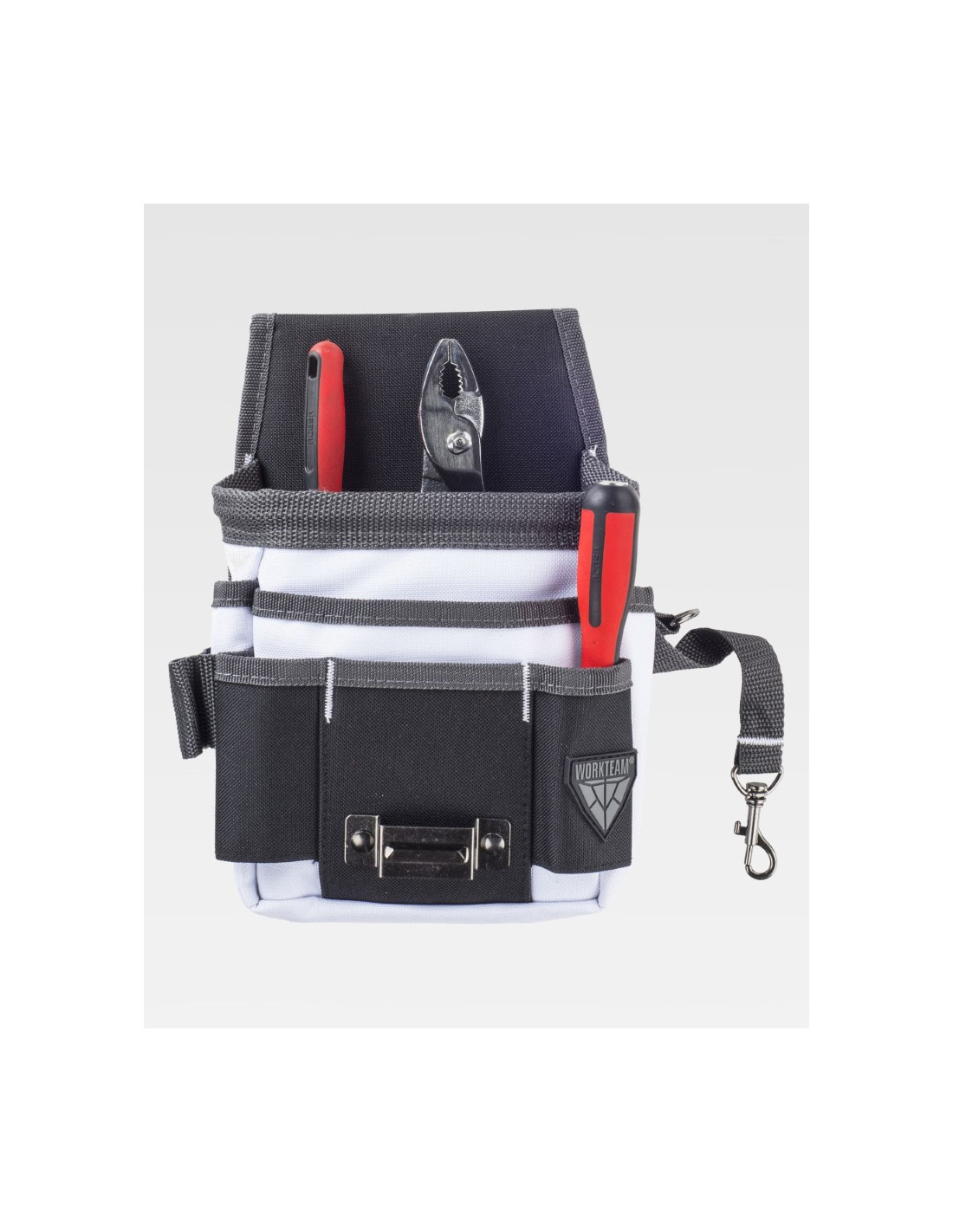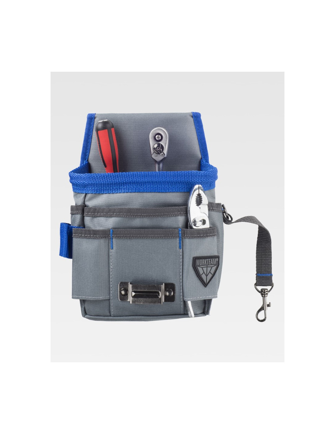 Bolsa para herramientas multibolsillos con diversas aberturas. Pestaña metálica para colgar cinta métrica. Argolla metálica y tira con mosquetón. Ajuste al cinturón mediante velcro. Bies a contraste. Dimensiones: 25x17x9 cm aprox.