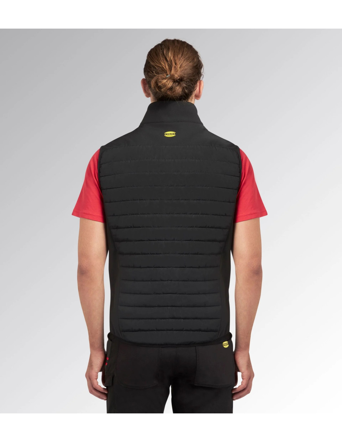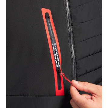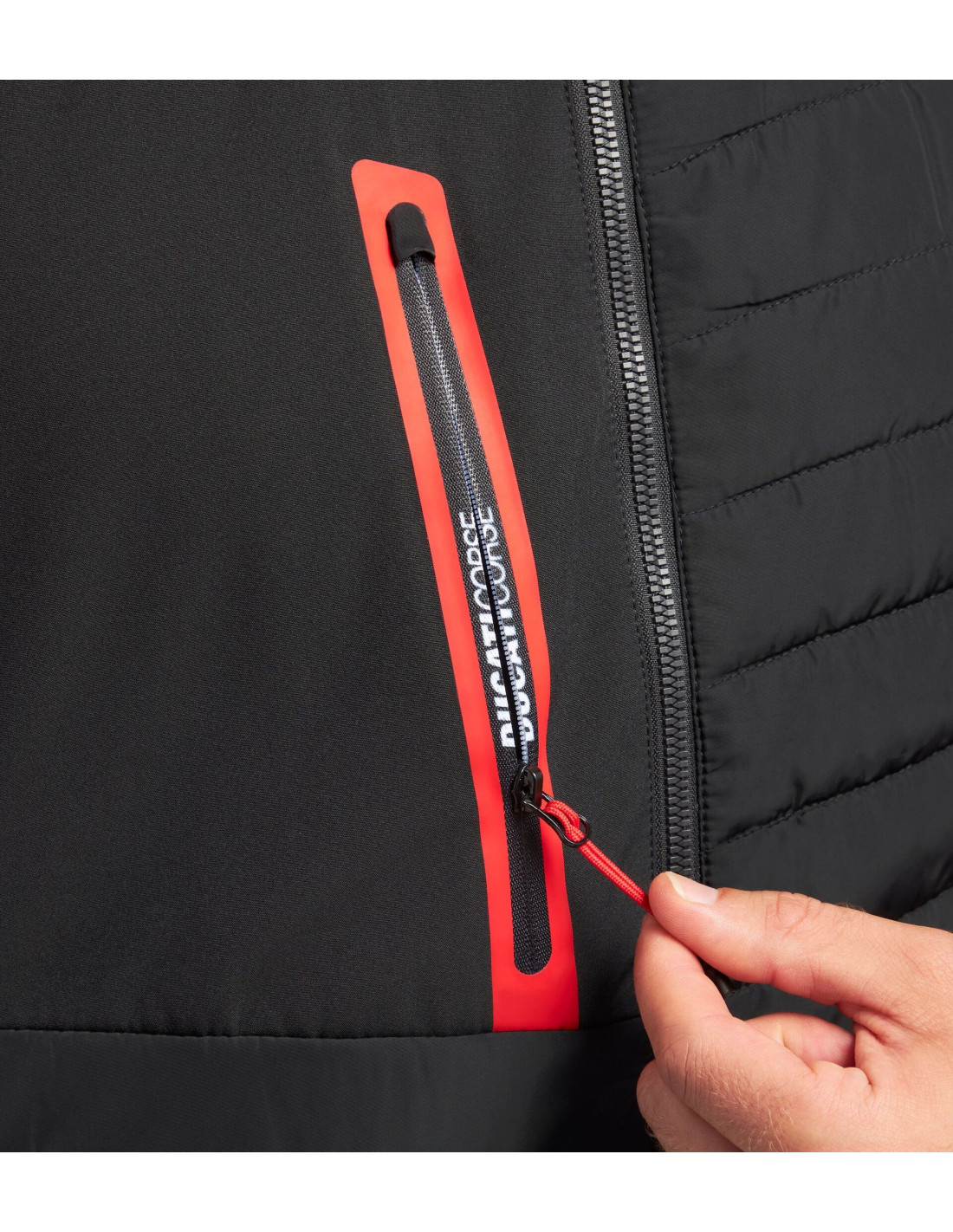 Materiales: Tejido principal: 100 % Poliéster. Tejido exterior y aplicaciones: Softshell, 94 % Poliéster, 6 % Elastano. Relleno: 100 % Guata, 120 g/m2