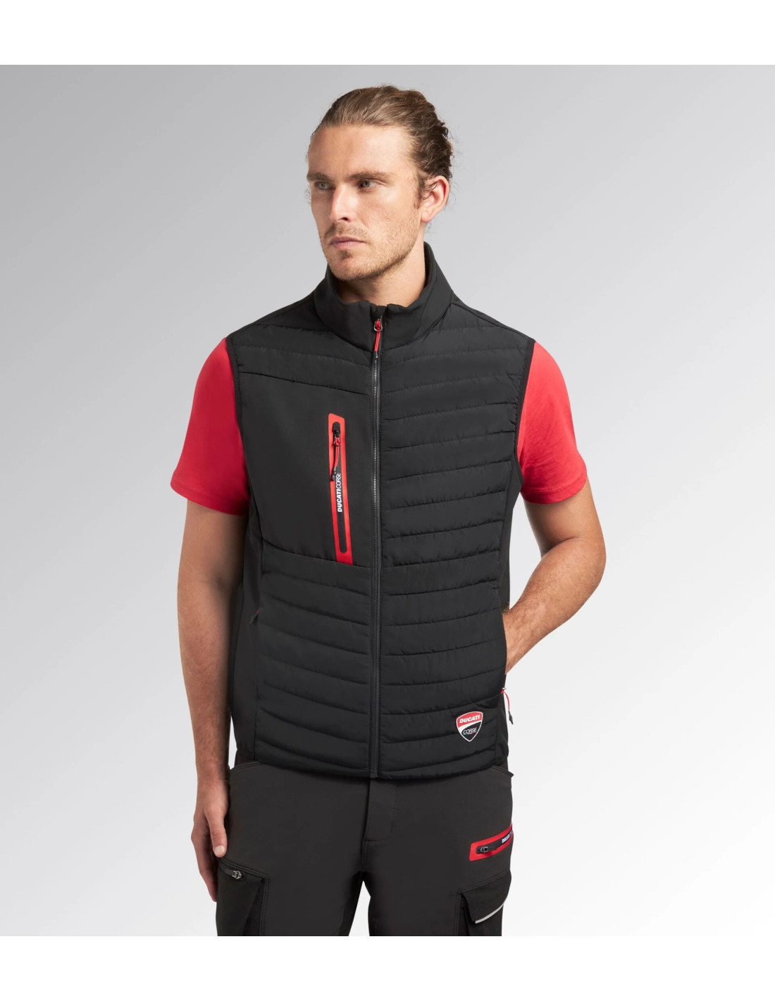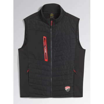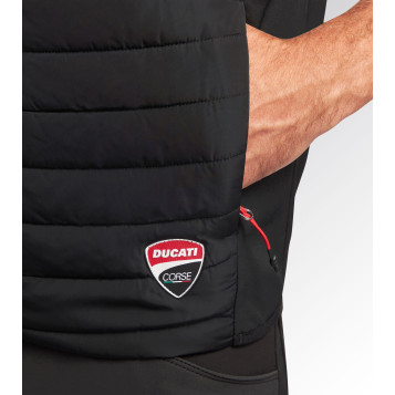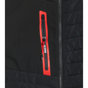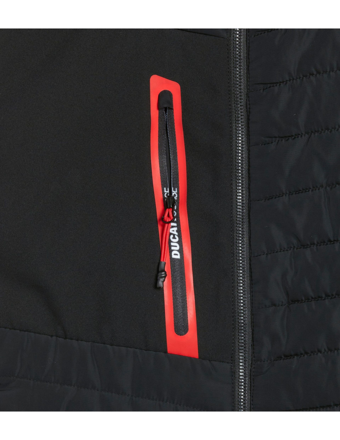 Cuello levantado con protector de mentón. Dos bolsillos laterales y un bolsillo en el pecho con detalle termosellado y personalización DUCATI CORSE, todos con cierre de cremallera.