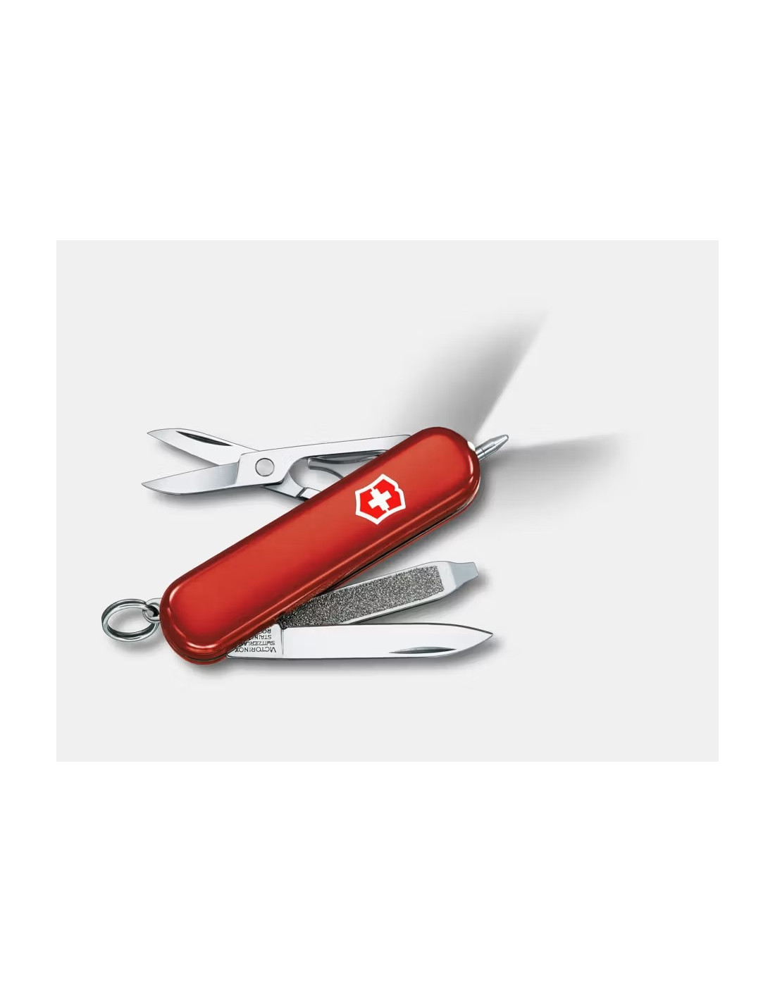 «¿Me prestas un bolígrafo?» Es una frase que podrás eliminar de tu vocabulario una vez que tengas la navaja Signature en tu bolsillo. Porque no solo incluye todas las características tradicionales de una navaja suiza, sino que también incluye un bolígrafo. Y con la incorporación de una brillante luz LED, ni siquiera la oscuridad te detendrá. La serie Signature te ofrece una protección inigualable.